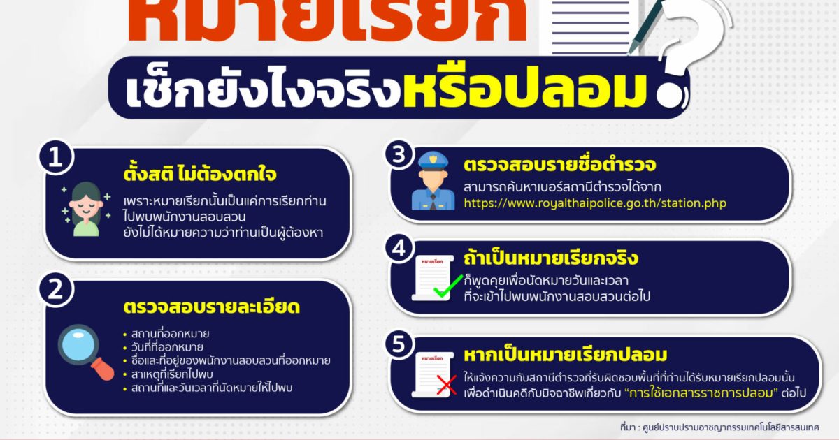 ถ้าคุณต้องเจอหมายเรียก แต่ไม่แน่ใจว่าจริงหรือปลอม วันนี้ศูนย์ฯ มีขั้นตอนการตรวจสอบว่าหมายเรียกที่ท่านได้รับเป็นของจริงหรือของปลอม ดังนี้