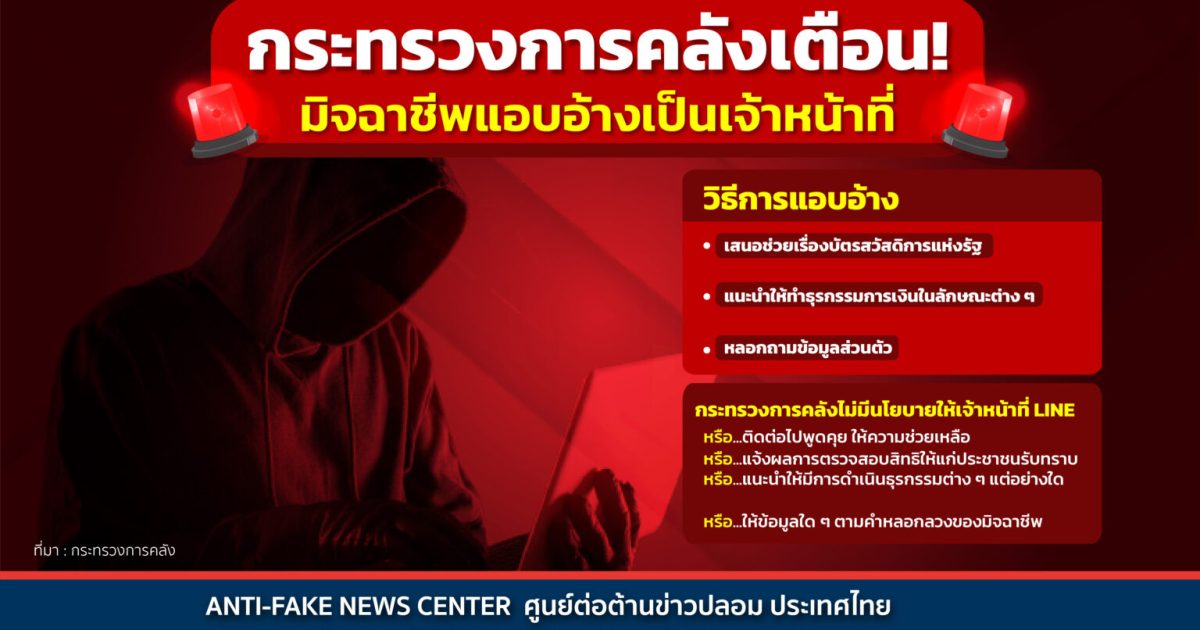 ขณะนี้กระทรวงการคลังตรวจสอบพบมิจฉาชีพจำนวนมากหลอกลวงประชาชน โดยแอบอ้างเป็นเจ้าหน้าที่กระทรวงการคลังหลากหลายตำแหน่งและหลายหน่วยงาน โดยเฉพาะการแอบอ้างเป็นผู้บริหารระดับสูงของกระทรวงการคลัง อาทิ นางชลิดา พันธ์กระวี ผู้ตรวจราชการกระทรวงการคลัง ผ่านทาง Application “LINE” โดยหลอกลวงให้ประชาชนหลงเชื่อว่าเป็นผู้ได้รับสิทธิตามโครงการลงทะเบียนเพื่อสวัสดิการแห่งรัฐ (โครงการฯ) ปี 2565 และแนะนำให้ทำธุรกรรมในลักษณะต่าง ๆ ซึ่งเสี่ยงต่อการสูญเสียทรัพย์สินเงินทอง หรือถูกหลอกถามข้อมูลส่วนตัวที่สำคัญซึ่งอาจจะก่อให้เกิดปัญหาตามมาได้