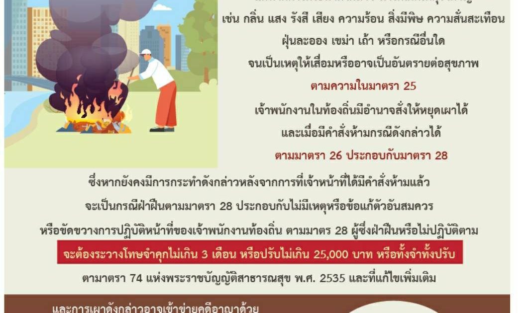 เผาในที่ของตนเอง แต่ทำให้เกิด กลิ่น ควัน เขม่า ฯลฯ สร้างความรำคาญต่อผู้อื่น เจ้าพนักงานท้องถิ่นมีอำนาจ สั่งให้หยุดเผาและห้ามเผาต่อไปได้