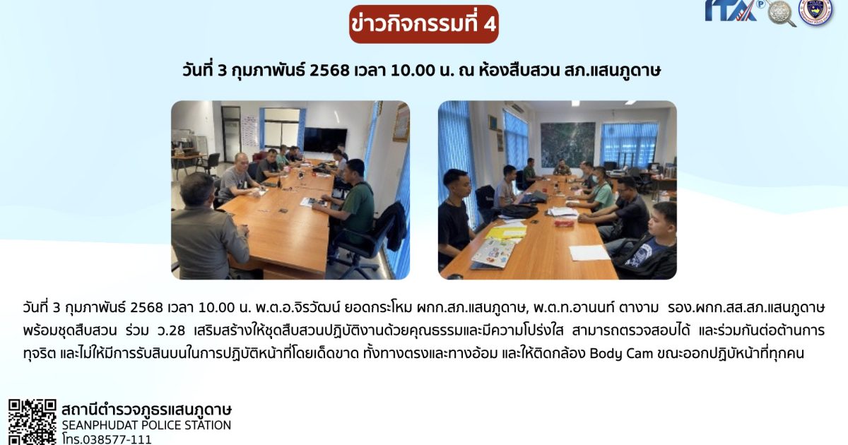 วันที่ 3 กุมภาพันธ์ 2568 เวลา 10.00 น. พ.ต.อ.จิรวัฒน์ ยอดกระโหม ผกก.สภ.แสนภูดาษ, พ.ต.ท.อานนท์ ตางาม  รอง.ผกก.สส.สภ.แสนภูดาษ พร้อมชุดสืบสวน ร่วม ว.28 เสริมสร้างให้ชุุดสืบสวนปฏิบัติงานด้วยคุณธรรมและมีความโปร่งใส สามารถตรวจสอบได้ และร่วมกันต่อต้านการทุจริต และไม่ให้มีการรับสินบนในการปฏิบัติหน้าที่โดยเด็ดขาด ทั้งทางตรงและทางอ้อม และให้ติดกล้อง Body Cam ขณะออกปฏิบัหน้าที่ทุกคน
