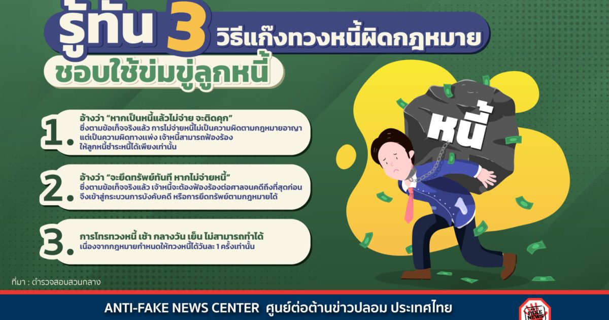 1. อ้างว่า “หากเป็นหนี้แล้วไม่จ่าย จะติดคุก” ซึ่งตามข้อเท็จจริงแล้ว การไม่จ่ายหนี้ไม่เป็นความผิดตามกฎหมายอาญา แต่เป็นความผิดทางเเพ่ง เจ้าหนี้สามารถฟ้องร้องให้ลูกหนี้ชำระหนี้ได้เพียงเท่านั้น