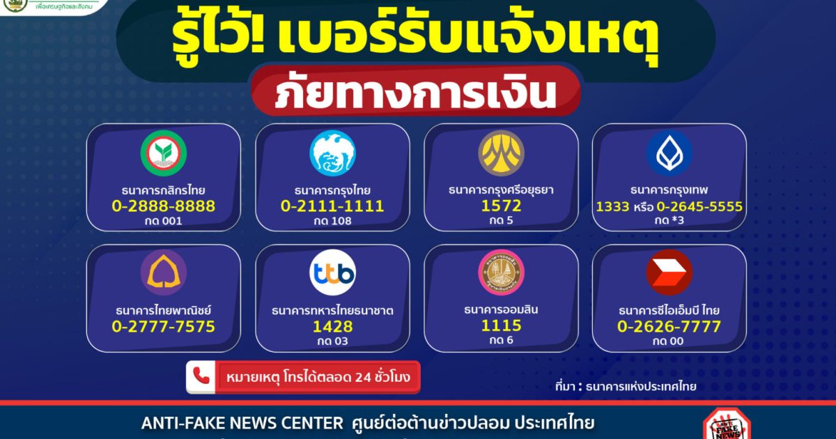 ภัยอันดับต้น ๆ ที่เราพบเจอได้บ่อย ณ เวลานี้ คือ ภัยทางการเงิน จากมิจฉาชีพที่มักจะมาในรูปแบบต่าง ๆ เช่น Call center เพจปลอมแอบอ้างชื่อธนาคาร ไลน์ปลอมแอบอ้างชื่อธนาคาร เป็นต้น ดังนั้น วันนี้ศูนย์ต่อต้านข่าวปลอม ประเทศไทย จึงมาบอกต่อช่องทางแจ้งเบาะแสภัยทางการเงิน ดังนี้