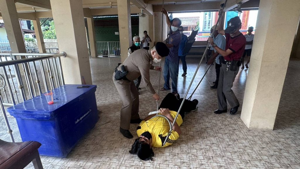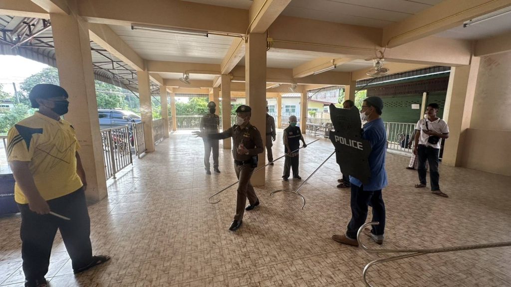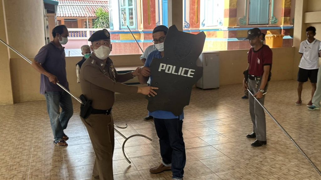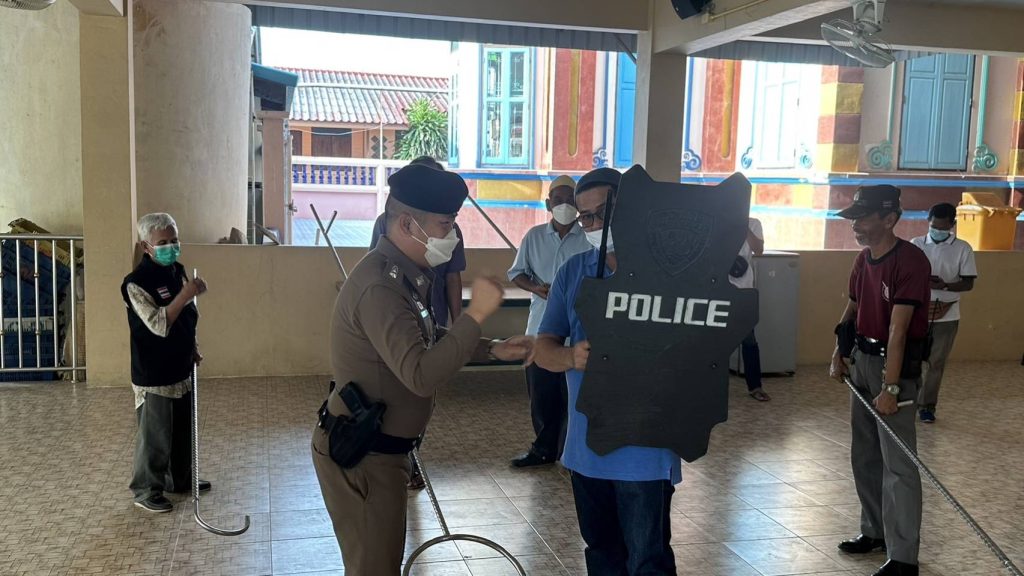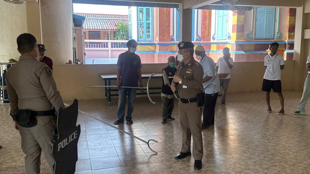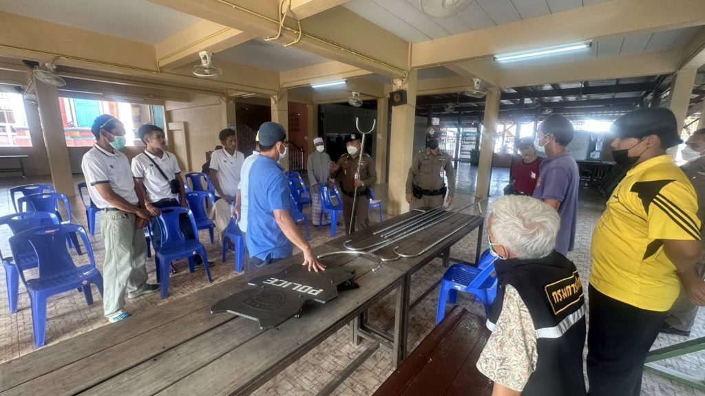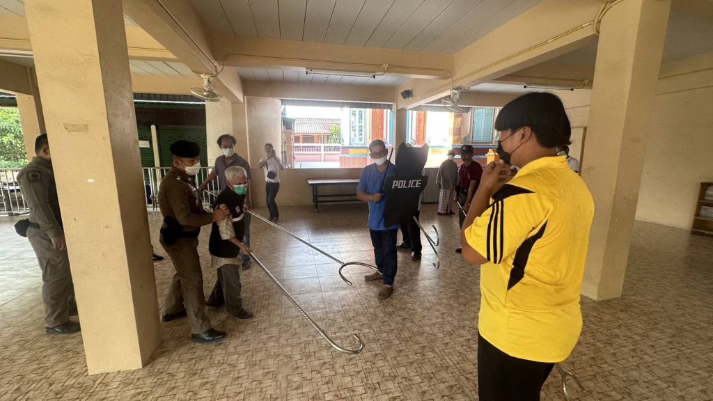 4.สาธิตและฝึกยุทธวิธีการใช้ไม้ง่าม ร่วมกับเจ้าหน้าที่ฝ่ายปกครองต.เกาะไร่ เพื่อให้เกิดความชำนาญและสามารถนำไปใช้ได้อย่างมีประสิทธิภาพ เพื่อระงับ ยับยั้งเบื้องต้น กรณีมีเหตุบุคคลคลุ้มคลั่งในพื้นที่