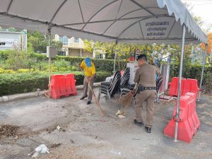 พ.ต.ต.กฤษณศักดิ์ ไชยป้อ สวป.สภ.แสนภูดาษ พร้อมด้วยข้าราชการตำรวจจิตอาสา สภ.แสนภูดาษ ร่วมกันดำเนินการปรับภูมิทัศน์ (เก็บกวาด เศษขยะ ใบไม้ ฉีดน้ำ ) บริเวณโดยรอบ หน้า สภ.แสนภูดาษ และเส้นทางสัญจร บริเวณหน้า สภ.แสนภูดาษ