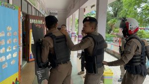 ร่วมกันซักซ้อมแผนเผชิญเหตุ กรณีคนร้ายคุ้มคลั่ง ก่อเหตุกราดยิง (หนี ซ่อน สู้) บริเวณโรงเรียนพิพิธประสาทสุนทร ต.ลาดขวาง อ.บ้านโพธิ์ จ.ฉะเชิงเทรา