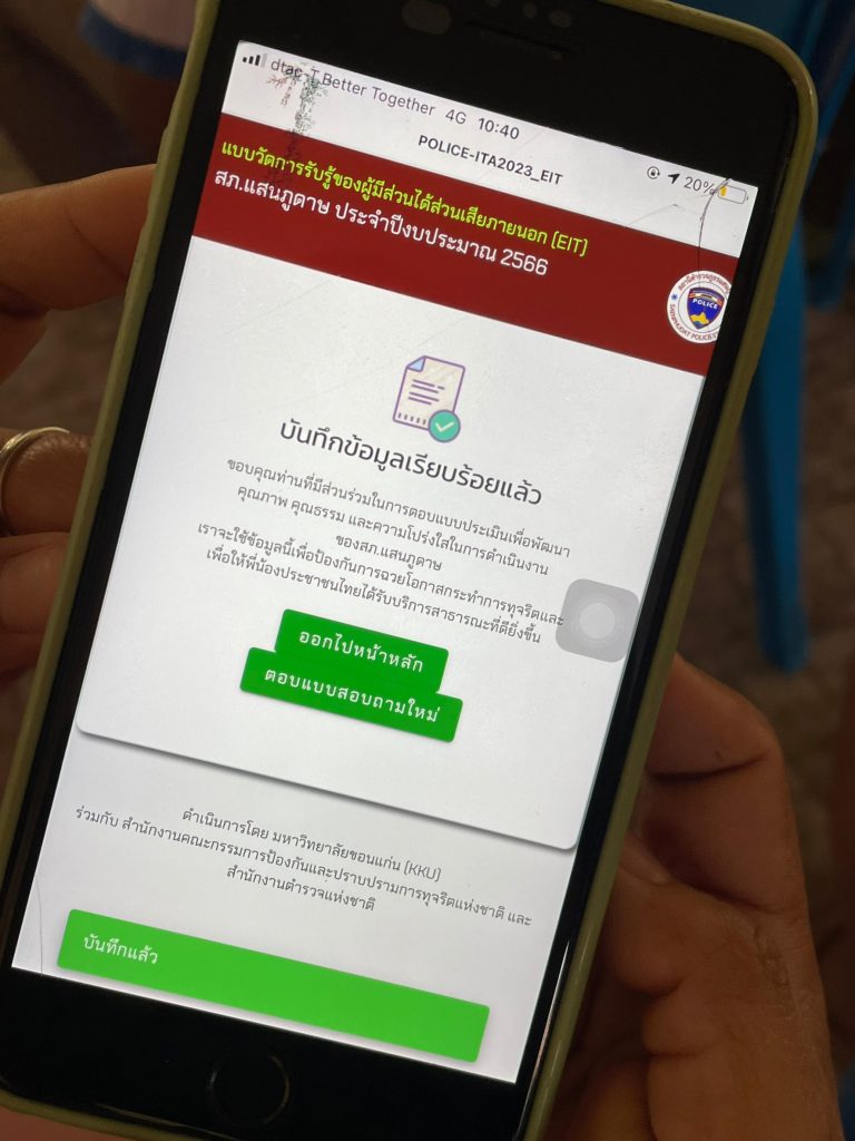 สภ.แสนภูดาษ ได้ออกชุมชนประชาสัมพันธ์ข้อมูลการประเมินคุณธรรมและความ โปร่งใสในการดำเนินงานของหน่วยงานภาครัฐ (Integrity and Transparency Assessment: ITA) ของสถานีตำรวจ ประจำปีงบประมาณ พ.ศ. 2566 ให้ประชาชนในพื้นที่ทราบโดยทั่วกัน และได้ดำเนินการให้ผู้ที่มาใช้บริการบนสถานีได้ร่วมตอบแบบสอบถามผ่านคิวอาร์โค้ด ที่ทางสภ. ได้ดำเนินการประชาสัมพันธ์ผ่านจุดบริการประชาชน และ รวมทั้งระบบออนไลน์