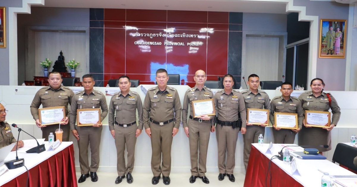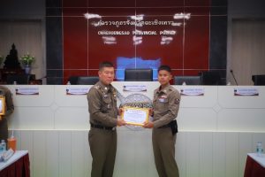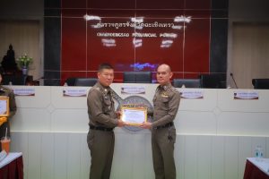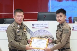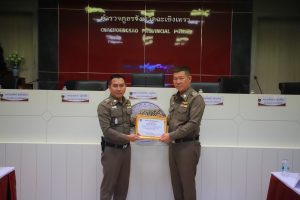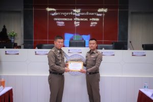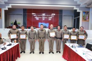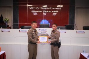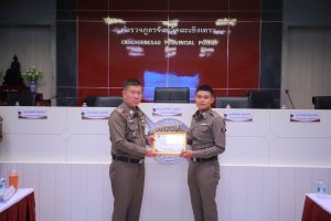 พร้อมกำลังเจ้าเจ้าหน้าที่ตำรวจสายงานป้องกันปราบปราม, สายงานจราจรและ สายงานสืบสวน เข้าประกาศเกียรติคุณในการปฏิบัติงานดีเด่นด้านการป้องกันปราบปราม เหตุโจรกรรมลักทรัพย์รถจักรยานยนต์ ในพื้นที่ สภ.แสนภูดาษ จาก พลตำรวจตรี เกรียงไกร บุญซ้อน ผู้บังคับการตำรวจภูธรจังหวัดฉะเชิงเทรา