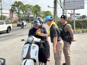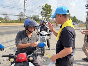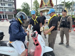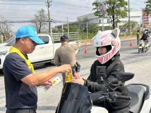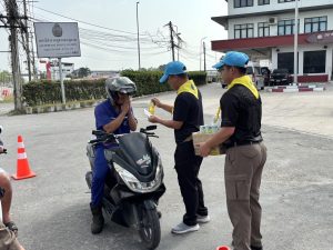 แจกน้ำดื่ม เครื่องดื่ม แจกแผ่นพับประชาสัมพันธ์ป้องกันและลดอุบัติเหตุทางถนน ให้กับประชาชนผู้เดินทางกับภูมิลำเนาในช่วงเทศกาลสงกรานต์ 2569