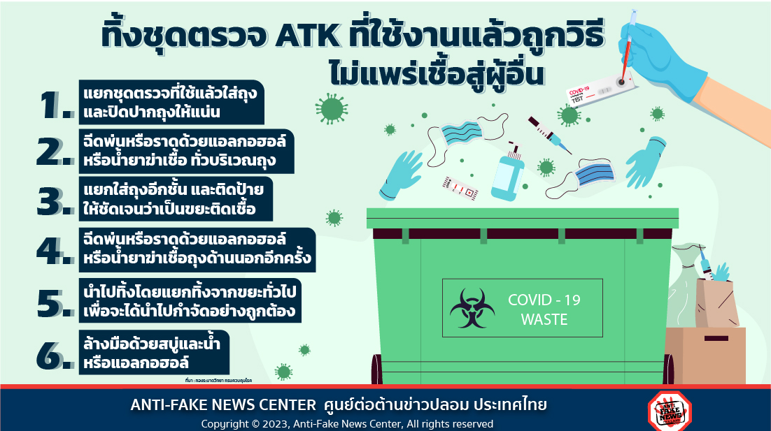ชุดตรวจ Antigen Test Kit (ATK) ที่ผ่านการใช้งานแล้ว จัดเป็น “ขยะติดเชื้อ” สามารถกลายเป็นแหล่งแพร่เชื