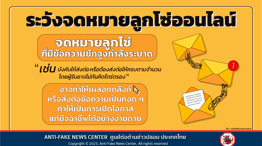จดหมายลูกโซ่ที่มีข้อความชักจูงกำลังระบาด เช่นบังคับให้ส่งต่อ หรือต้องส่งต่อให้ครบตามจำนวน โดยผู้รับอ