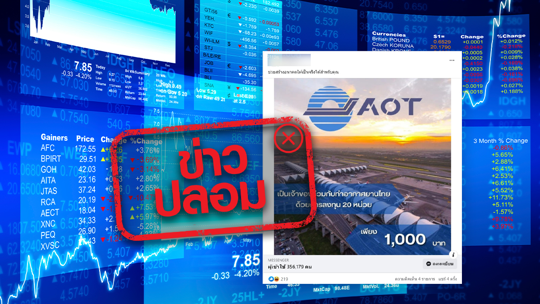 ข่าวปลอม อย่าแชร์! AOT เปิดให้ลงทุน 20 หน่วย ในราคา 1,000 บาท ผ่านเพจ Stame12