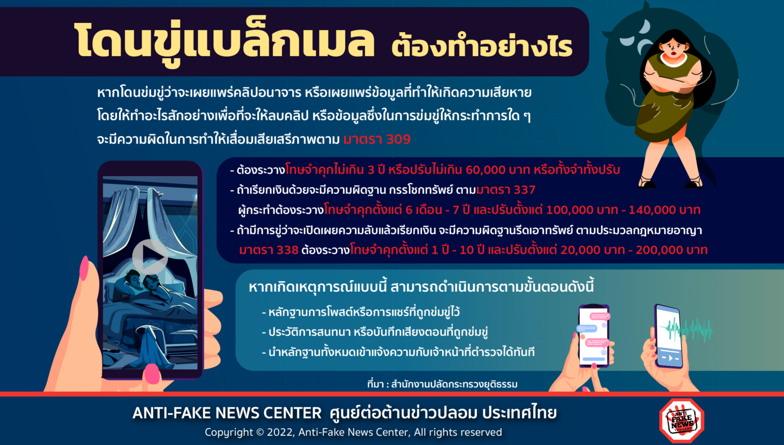 หากโดนข่มขู่ว่าจะเผยแพร่คลิปอนาจาร หรือเผยแพร่ข้อมูลที่ทำให้เกิดความเสียหายโดยให้ทำอะไรสักอย่างเพื่อ