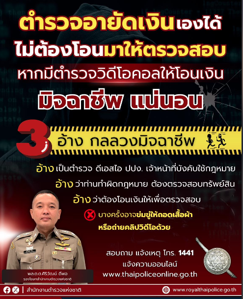 ตำรวจอายัดเงินเองได้ ไม่ต้องโอนมาให้ตรวจสอบหากมีตำรวจวิดีโอคอลให้โอนเงิน มิจฉาชีพแน่นอน เมื่อวันที่