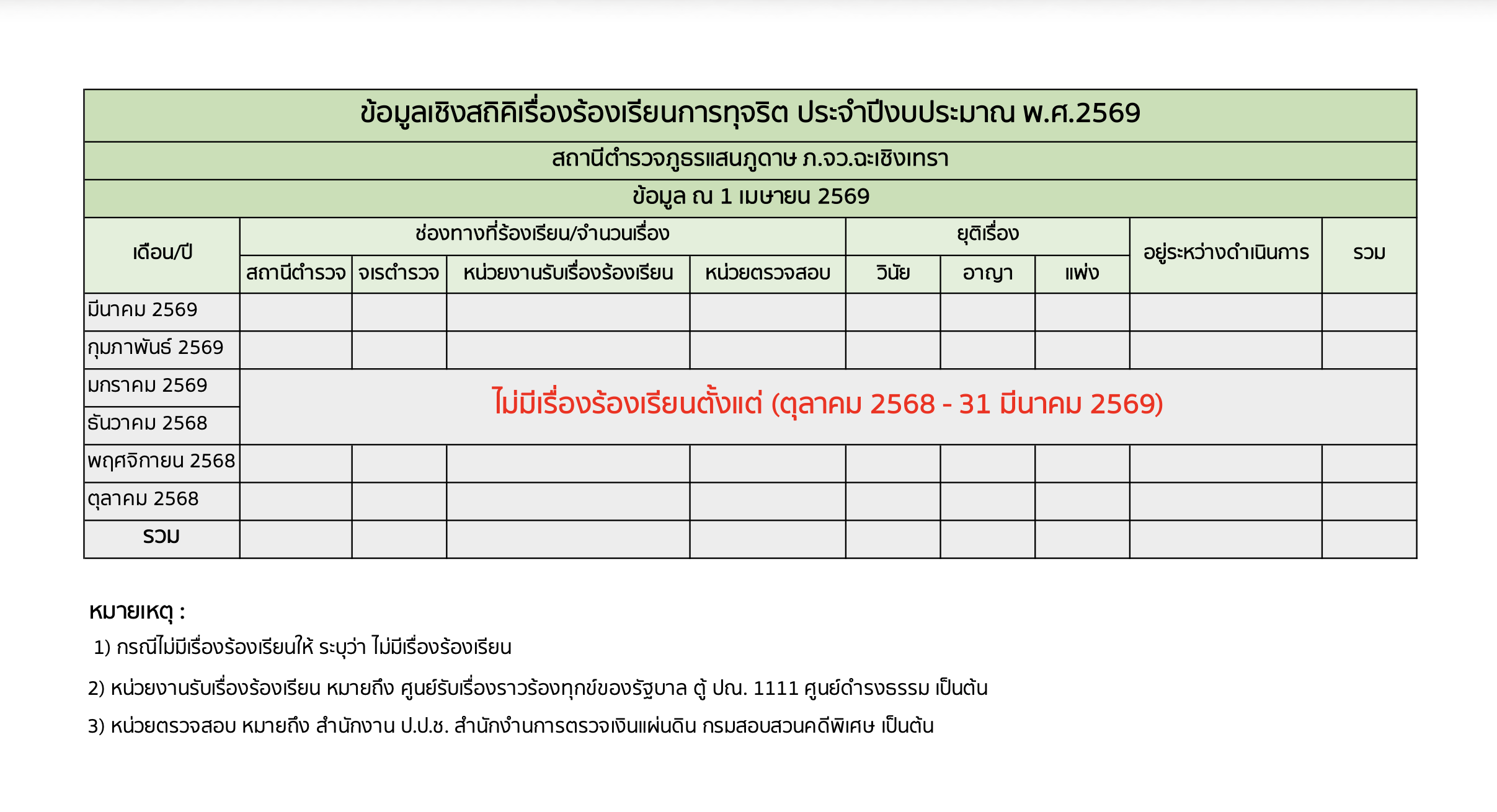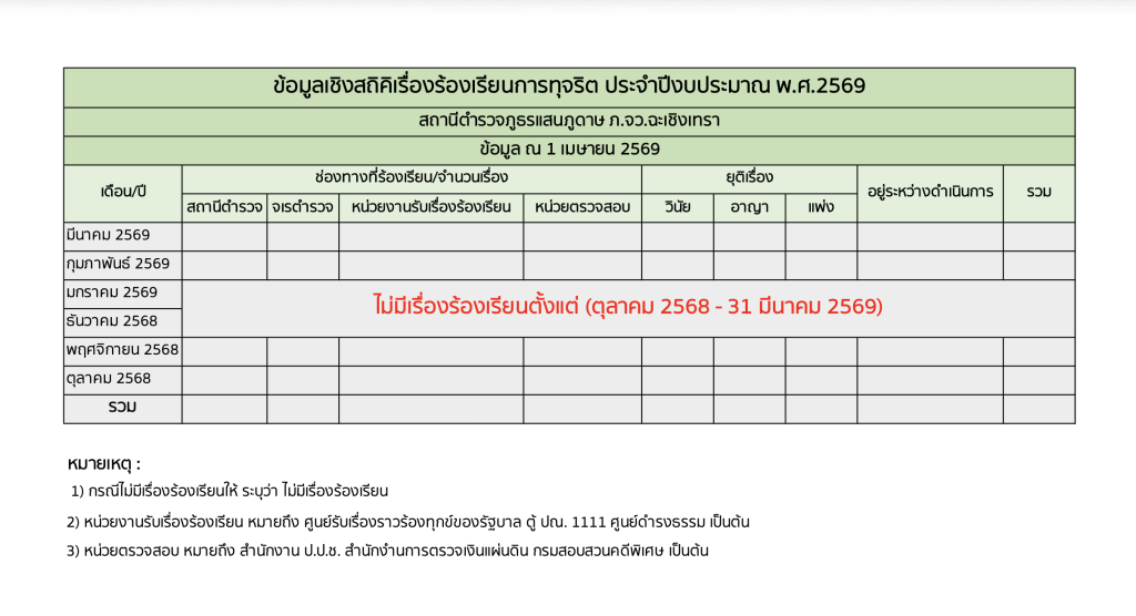 ข้อมูลสถิติเรื่องร้องเรียนการทุจริตของสถานีตำรวจภูธรแสนภูดาษ ภ.จว.ฉะเชิงเทรา