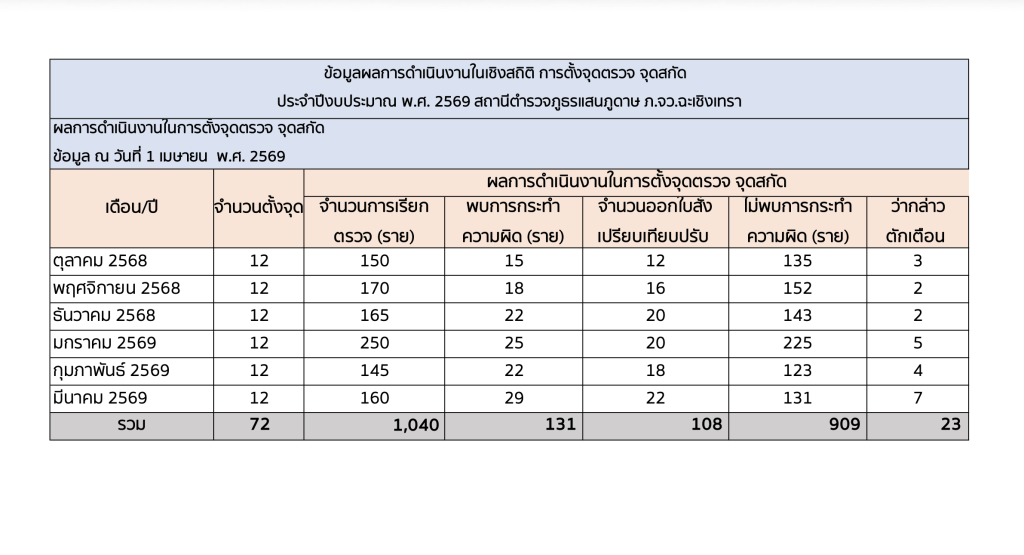 ข้อมูลผลการดำเนินงานเชิงสถิติในการตั้งจุดตรวจ จุดสกัด (ปีงบประมาณ พ.ศ.2569 ตุลาคม 2568 - มีนาคม 2569